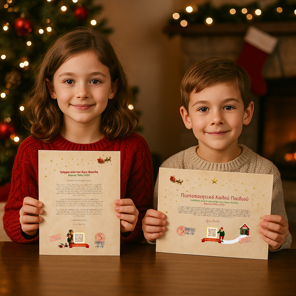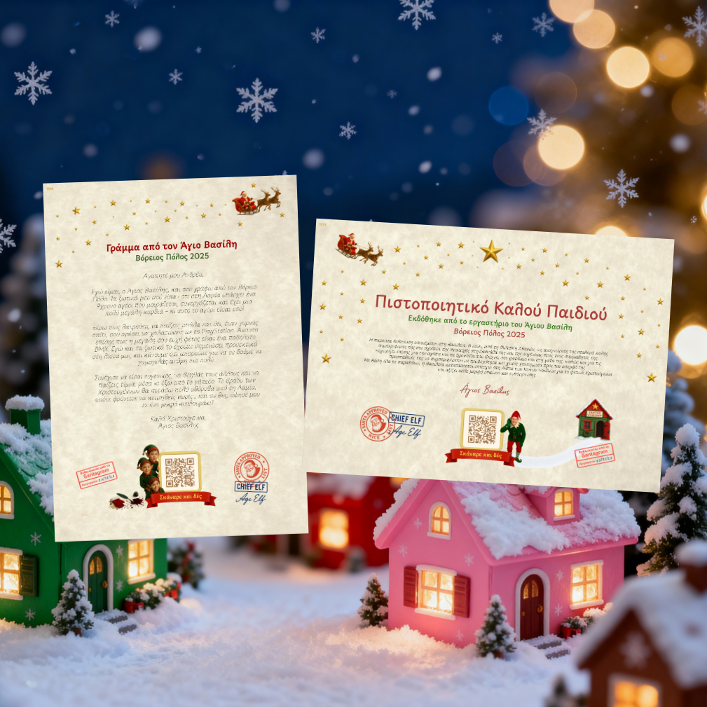 - Πιστοποιητικό Καλού Παιδιού με QR code από τον Άγιο Βασίλη σε μορφή PDF/PNG.