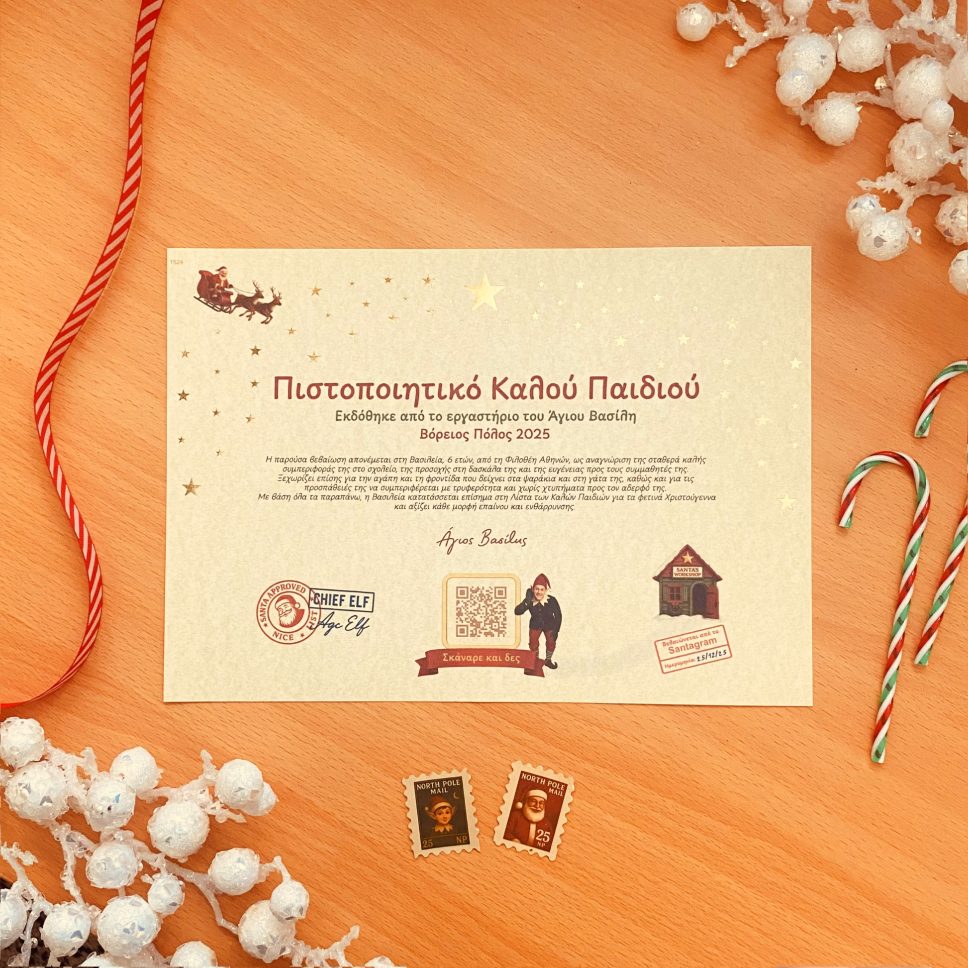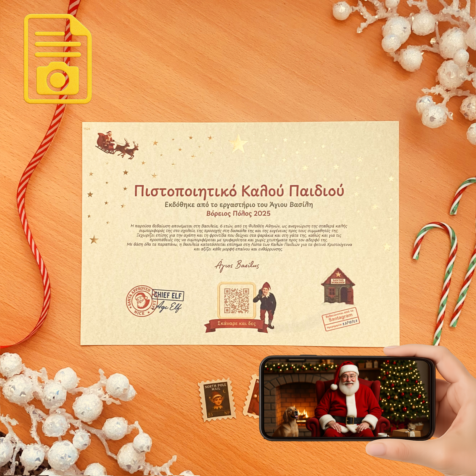 • Πιστοποιητικό Καλού Παιδιού με QR code που οδηγεί σε μοναδικό βίντεο επιβράβευσης από τον ίδιο τον Άγιο Βασίλη.