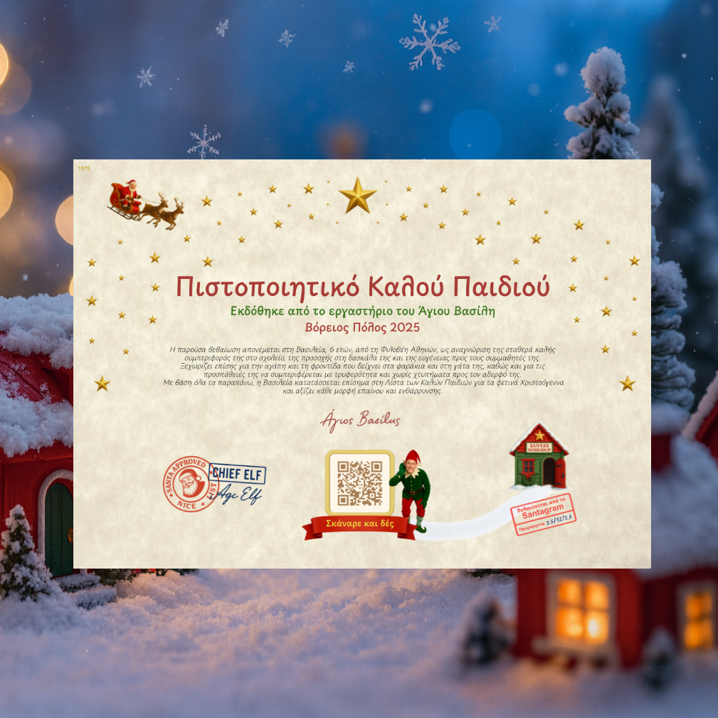 Ένα πιστοποιητικό με προσωπικό βιντεομήνυμα.Συμπληρώνετε τα στοιχεία της φόρμας και αν θέλετε προσθέτετε ένα προσωπικό μήνυμα από τον Άγιο Βασίλη. Με τα σύγχρονα εργαλεία σύνθεσης κειμένου που διαθέτουμε, το περιεχόμενο «γράφεται» πάνω στο παιδί. Ο Άγιος Βασίλης μιλάει σε δύο γλώσσες Ελληνικά ή Αγγλικά και απευθύνεται όμορφα και σε μεγαλύτερα παιδιά ακόμη και σε εφήβους ή ενήλικες, όταν το ζητήσετε.