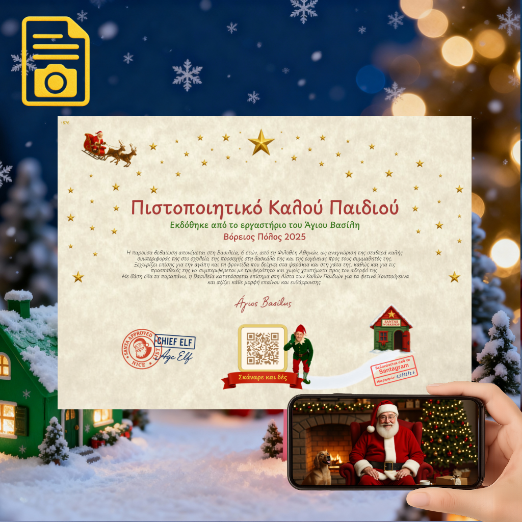 Το ψηφιακό πιστοποιητικό που συνοδεύεται με το μαγικό QR έχει πιο επίσημο/τιμητικό ύφος, ενω το βίντεο δίνει στον Άγιο Βασίλη διαφορετικό χαρακτήρα ανάλογα με τα στοιχεία που μας δώσατε,ώστε οι δύο μορφές να συμπληρώνουν η μία την άλλη.