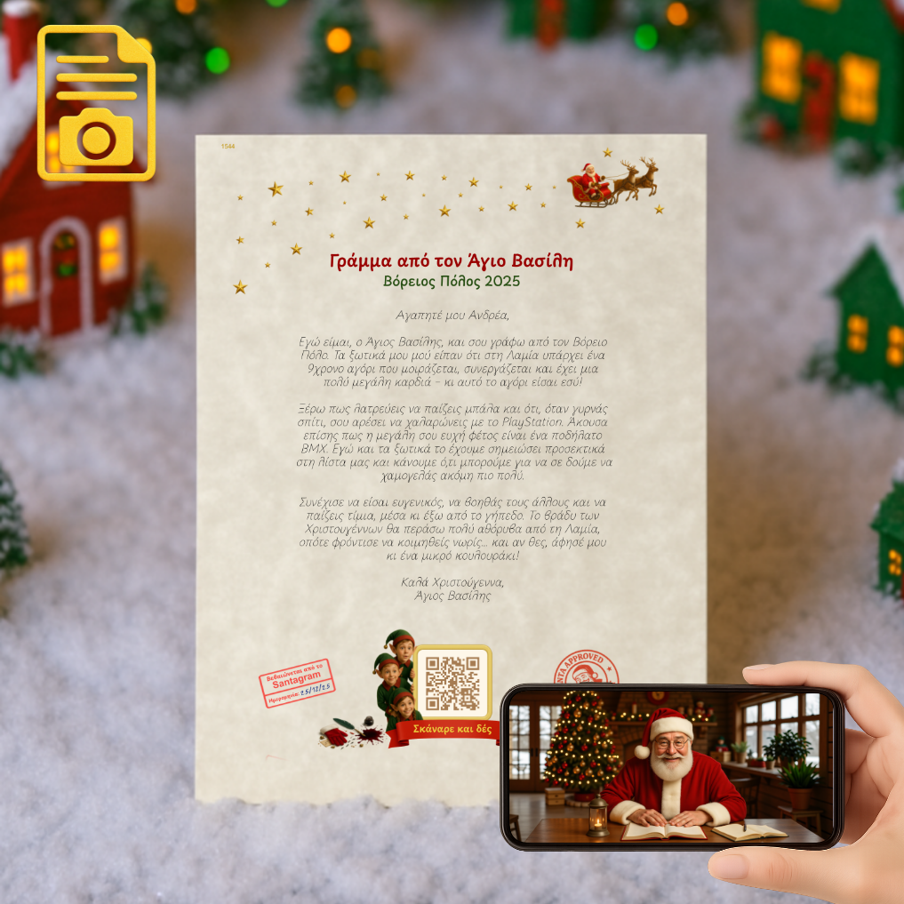 Το έντυπο παραδίδεται σε premium A4 χαρτί υψηλής ποιότητας με λαμπερές λεπτομέρειες χρυσοτυπίας. Δωρεάν αποστολή σε όλη την Ελλάδα με Courier/ΕΛΤΑ και παράδοση ψηφιακά την επόμενη εργάσιμη στο email σας (PDF για εκτύπωση, PNG και MP4 για προβολή και για να το κρατήσετε). Το Santagram.gr είναι η πιο σύγχρονη τεχνολογία στην υπηρεσία της μαγείας, από τον Βόρειο Πόλο μέχρι το σαλόνι σας.