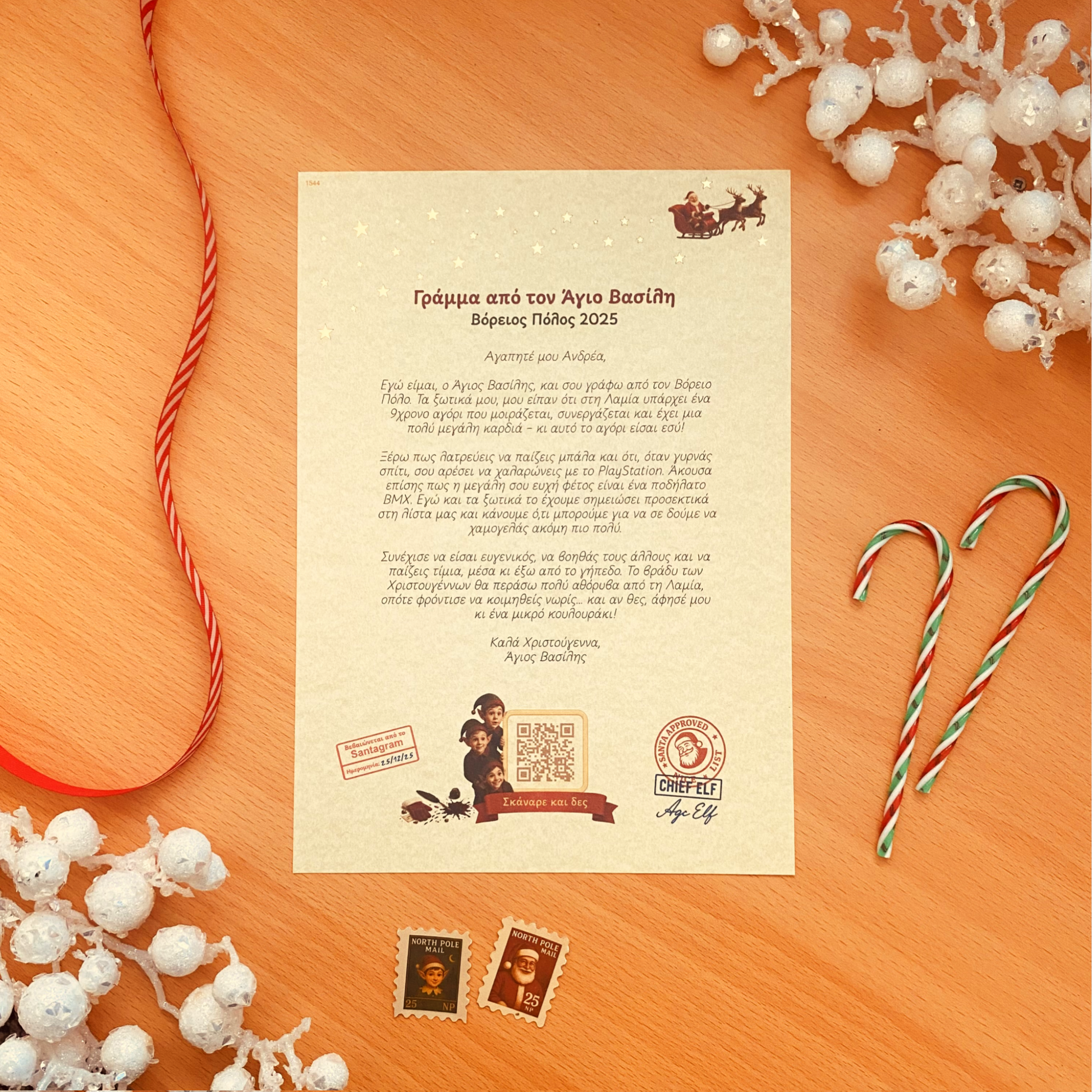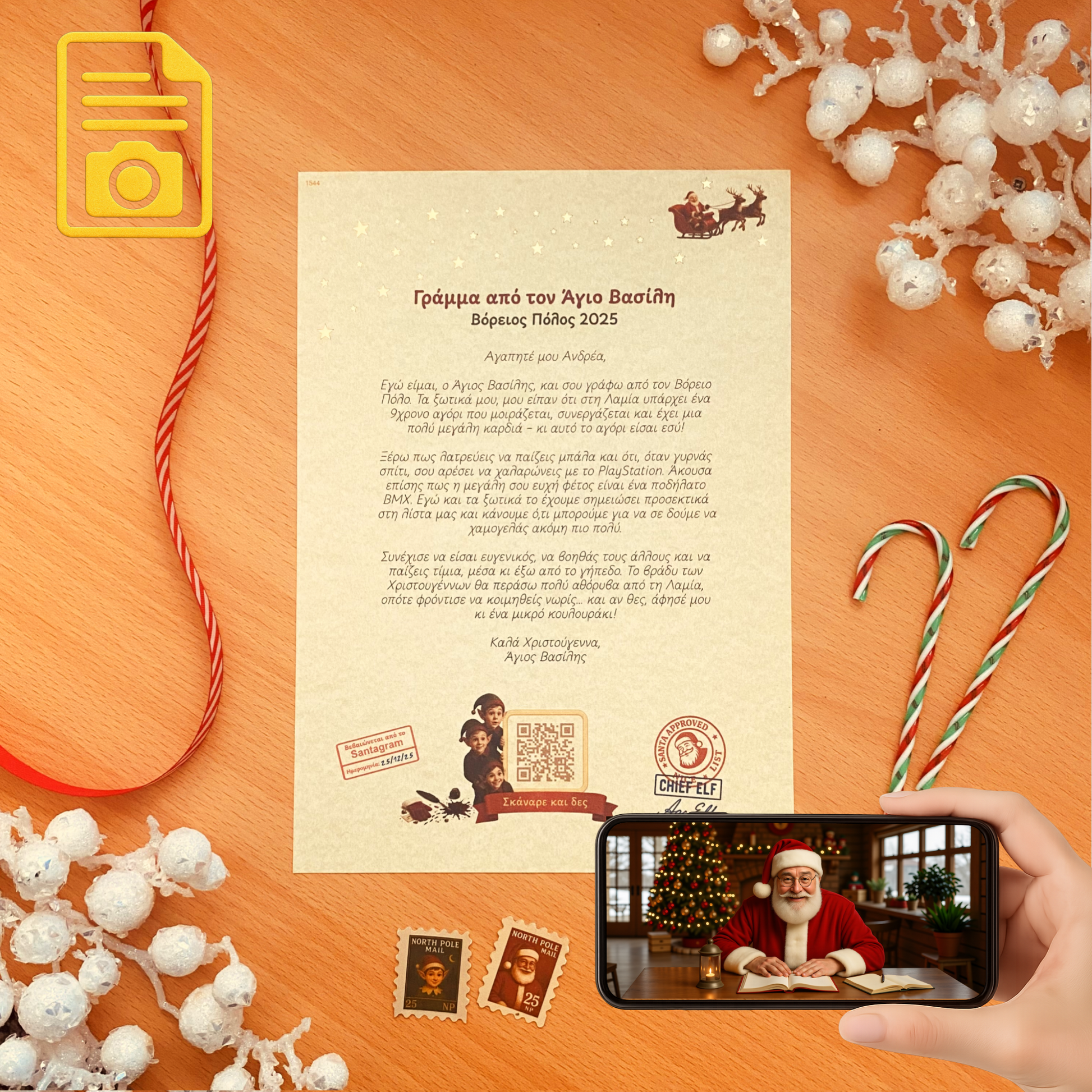 Ο Άγιος Βασίλης μιλάει σε δύο γλώσσες, Ελληνικά ή Αγγλικά, και απευθύνεται άφοβα και σε μεγαλύτερα παιδιά - ακόμη και σε εφήβους ή ενήλικες, όταν το ζητήσετε. Στο κάτω μέρος του γράμματος θα βρείτε το μαγικό QR, όπου με ένα σκανάρισμα ζωντανεύει ο Άγιος Βασίλης στο κινητό, το tablet ή τον υπολογιστή σας.