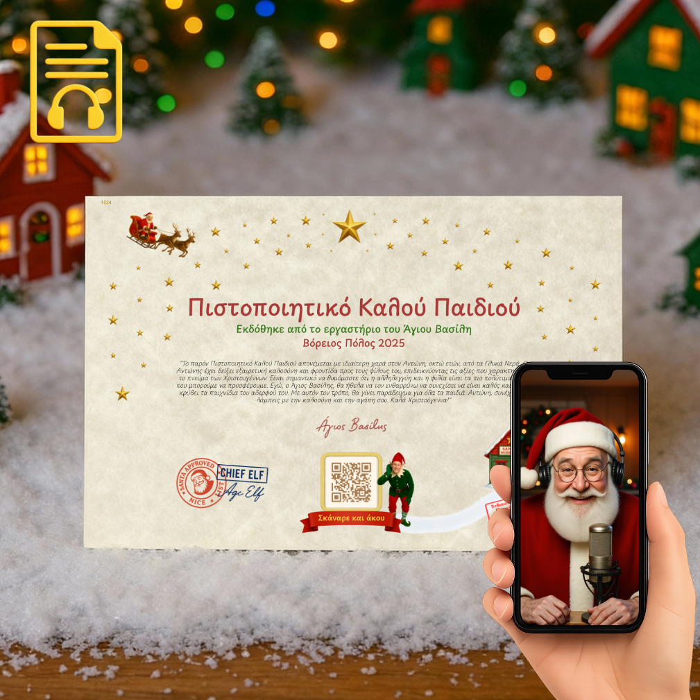 Το κείμενο που τυπώνεται στο πιστοποιητικό δεν είναι ίδιο με το ηχητικό μήνυμα· η έντυπη διατύπωση είναι επίσημη και τιμητική, ενώ η αφήγηση είναι πρόσχαρη και ενθουσιώδης, ώστε οι δύο μορφές να συμπληρώνουν η μία την άλλη. Το αποτέλεσμα είναι μια επίσημη επιβράβευση με χαρακτήρα, που κάνει το παιδί να νιώθει ότι ο Άγιος Βασίλης το γνωρίζει αληθινά.