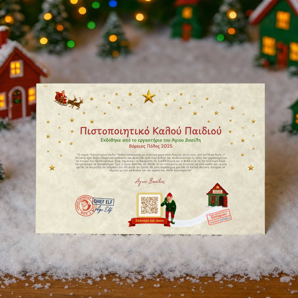 Το πιστοποιητικό που ζωντανεύει την απονομή κάθε φορά. Συμπληρώνετε τη φόρμα και, αν θέλετε, προσθέτετε ένα προσωπικό μήνυμα από τον Άγιο Βασίλη. Με τα σύγχρονα εργαλεία σύνθεσης κειμένου που διαθέτουμε, το περιεχόμενο «γράφεται» πάνω στο παιδί: το όνομά του, η ηλικία του και η δική του καθημερινότητα.