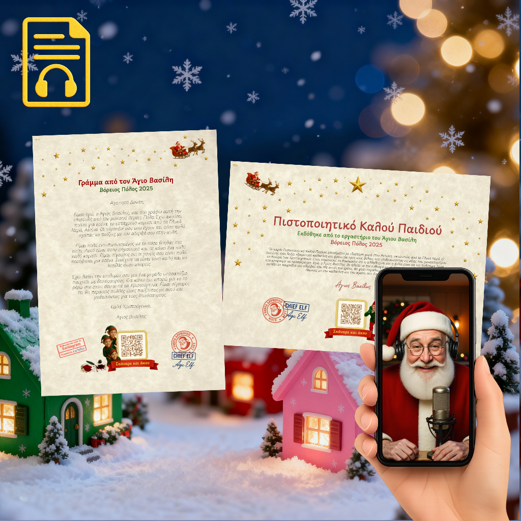 Το Ψηφιακό Πακέτο Ήχου είναι η άμεση, ολοκληρωμένη εμπειρία του Santagram χωρίς ταχυδρομείο. Παραλαμβάνετε το Γράμμα και το Πιστοποιητικό Καλού Παιδιού μαζί με το ηχητικό μήνυμα του Αγίου Βασίλη. Κάθε αρχείο φέρει το δικό του QR Ήχου: με ένα σκανάρισμα, ο Άγιος Βασίλης προσφωνεί το παιδί με το όνομά του και μιλά σε πρώτο πρόσωπο με ζεστό, φυσικό τρόπο. Συμπληρώνετε τα στοιχεία με βάση την φόρμα και με σύγχρωνά εργαλεία σύνθεσης κειμένου που διαθέτουμε δημιουργούμε το απόλυτο πακέτο.