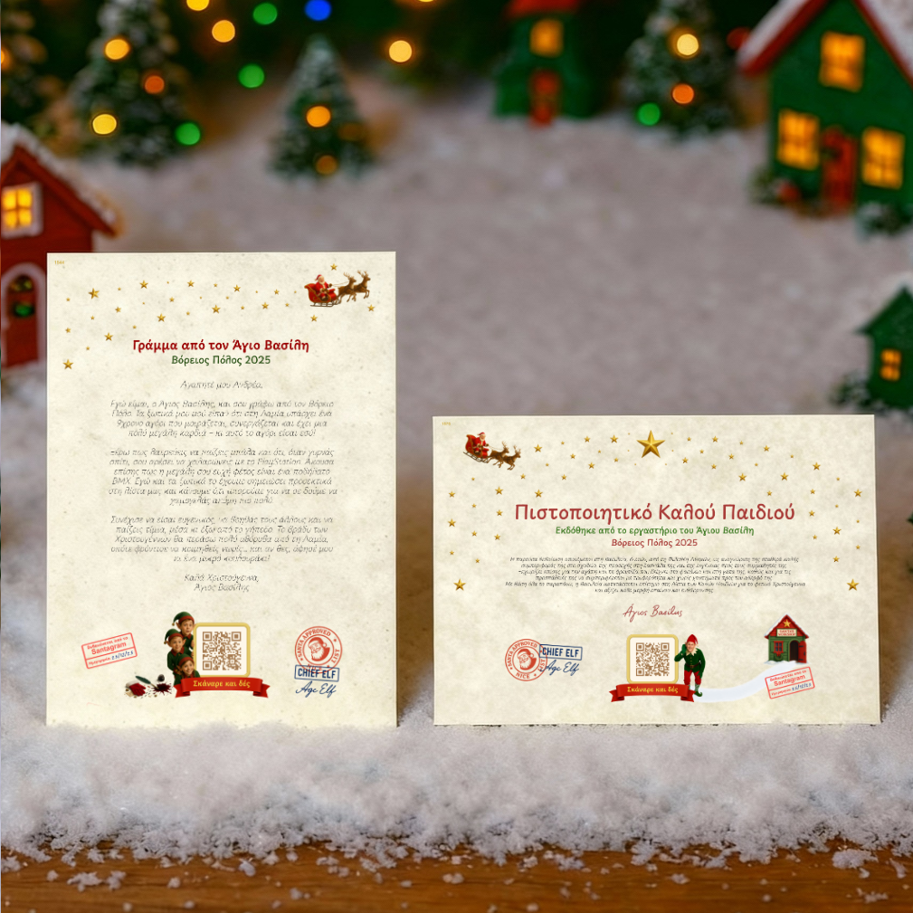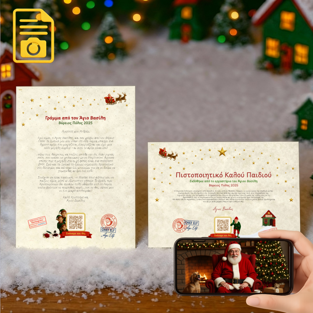 Ολοκληρωμένο πακέτο όπου γράμμα και πιστοποιητικό ζωντανέυουν με δύο διαφορετικά βίντεο μέσω QR. Συμπληρώνετε τα στοιχεία με βάση την φόρμα και με σύγχρωνά εργαλεία σύνθεσης κειμένου που διαθέτουμε δημιουργούμε για εσάς το απόλυτο πακέτο. Ο Άγιος Βασίλης μιλάει σε δύο γλώσσες, Ελληνικά ή Αγγλικά, και απευθύνεται σε όλες τις ηληκίες, ακόμα και σε ενήληκες.